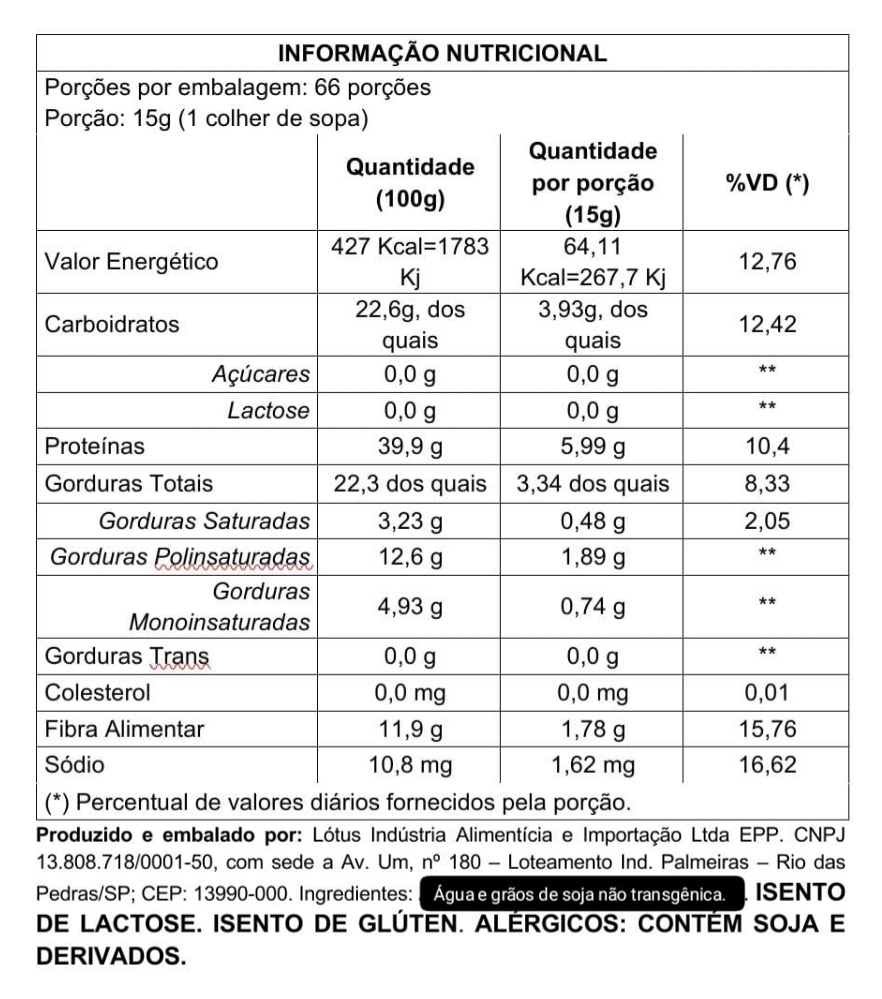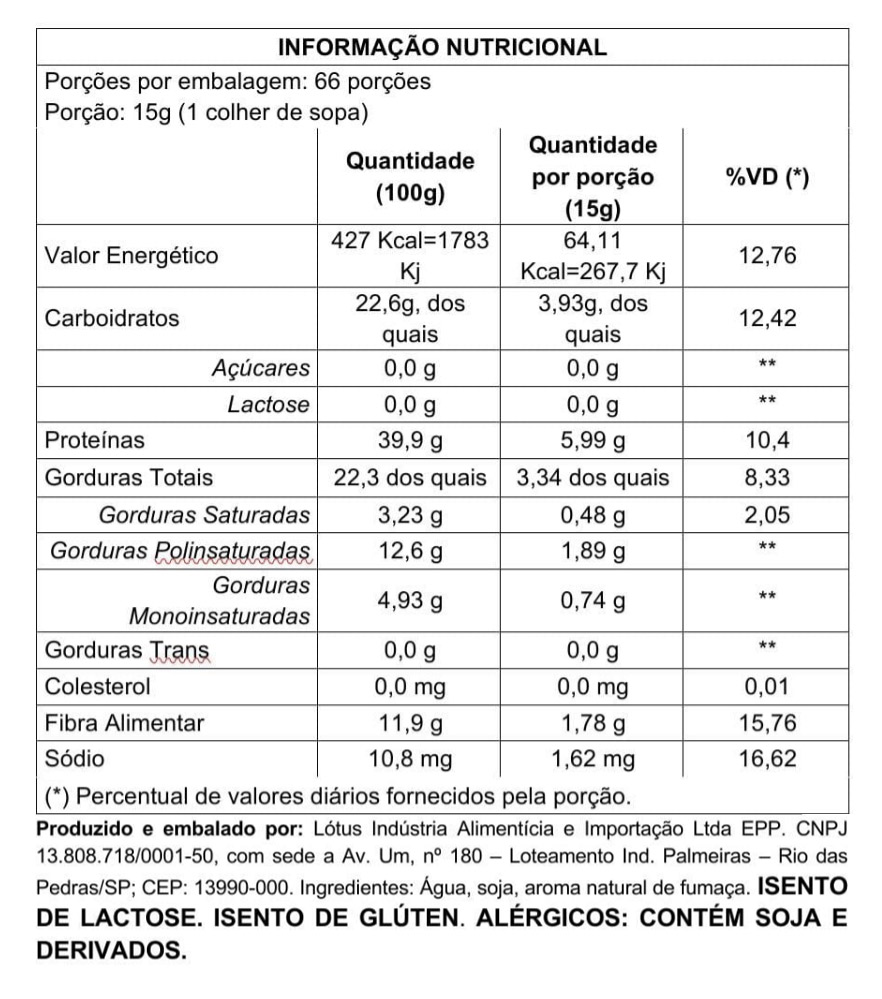 Água, grãos de soja não transgênica e aroma natural de fumaça.